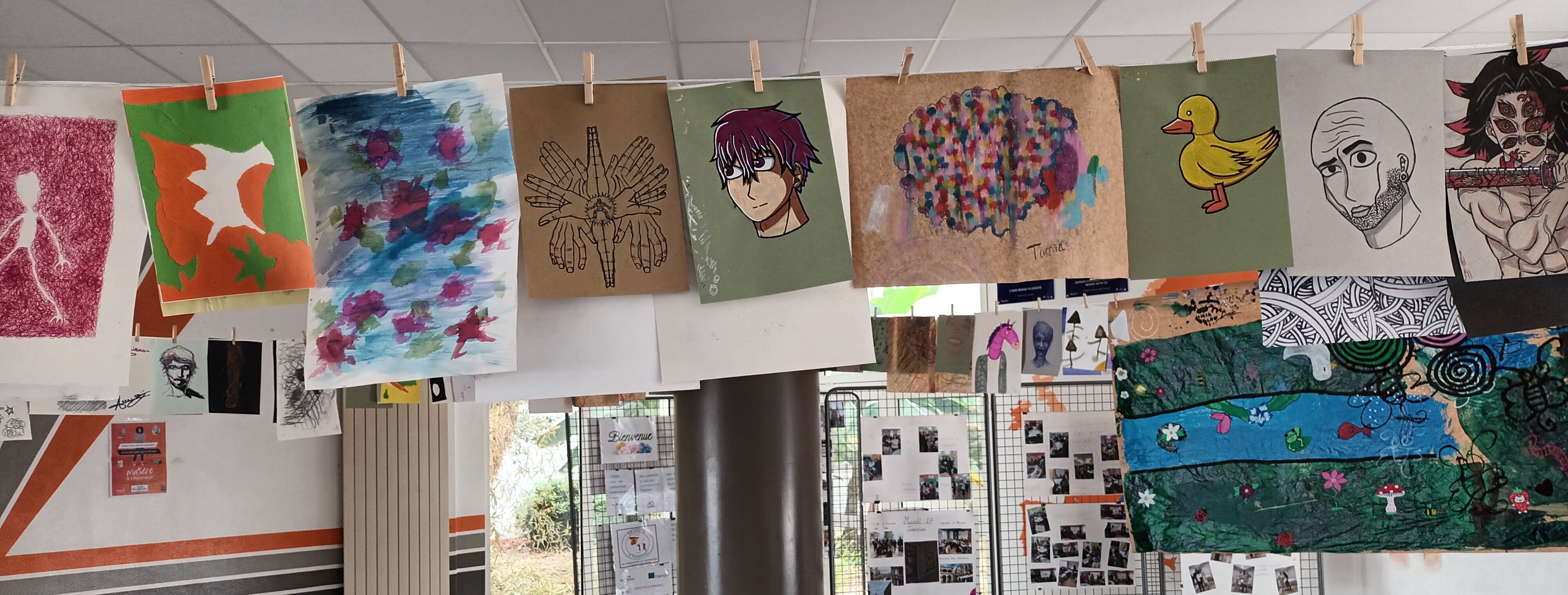 Les élèves de l’atelier Arts Plastiques de l’internat ont étendu leur grande lessive dans le hall du bâtiment 13.